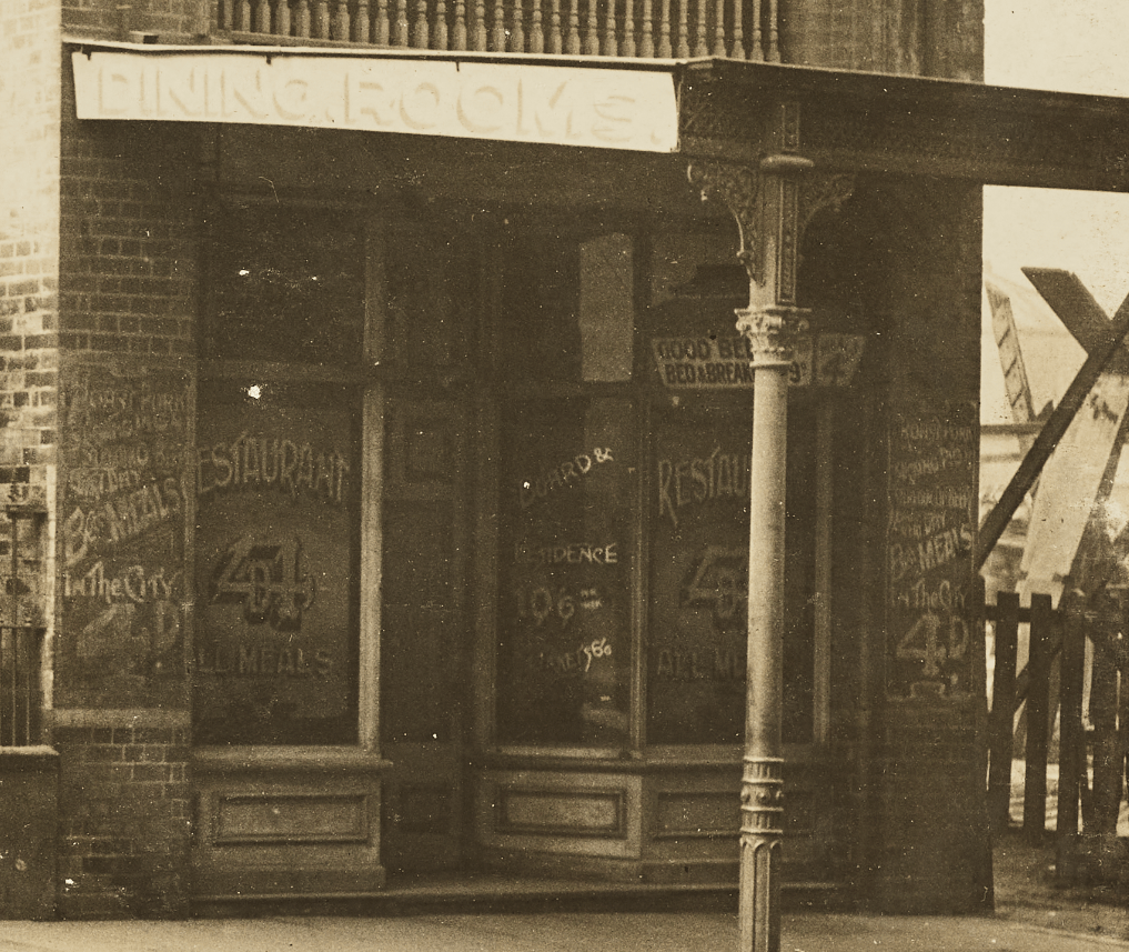 All of JA’s restaurants were advertised as a “4d restaurant”(4 pence) where you can get a meal for approx. 4 cents which compares to $3 now. The meal advertised on the chalkboard was “Roast pork sucking pig” and is written as “Best meals in the city”.
