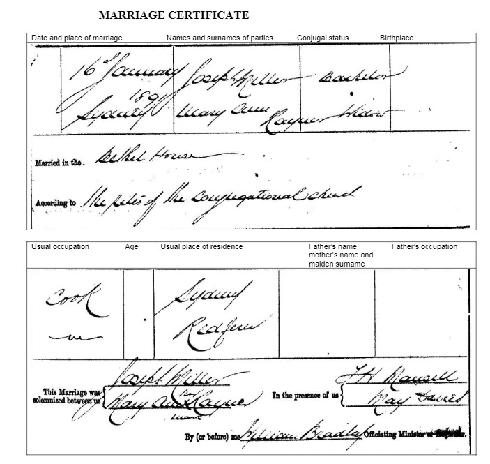 After many years of searching, in 2019 I located the marriage certificate of Joseph Miller and Mary Ann Rayner, dated 16 January 1891. The groom is recorded simply as Joseph Miller, occupation cook, and the marriage took place at Bethel House, a mission church for mariners — an entirely consistent setting for a Jamaican-born seaman who had worked as a ship’s cook and steward before his discharge in 1888. On the certificate, Mary Ann Rayner is recorded as a widow.