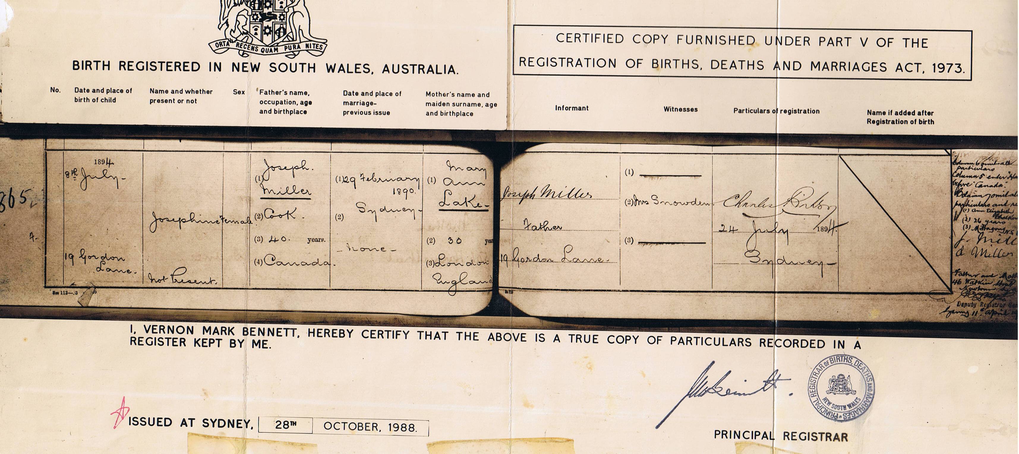 On Josephine’s birth certificate, the mother was amended from Mary Ann Lake of London, aged 30, to Ann Elizabeth Chalker of Mittagong, aged 26. Joseph’s birthplace was corrected from Canada to Halifax, Canada, and the recorded marriage date of 29 February 1890 was deleted.