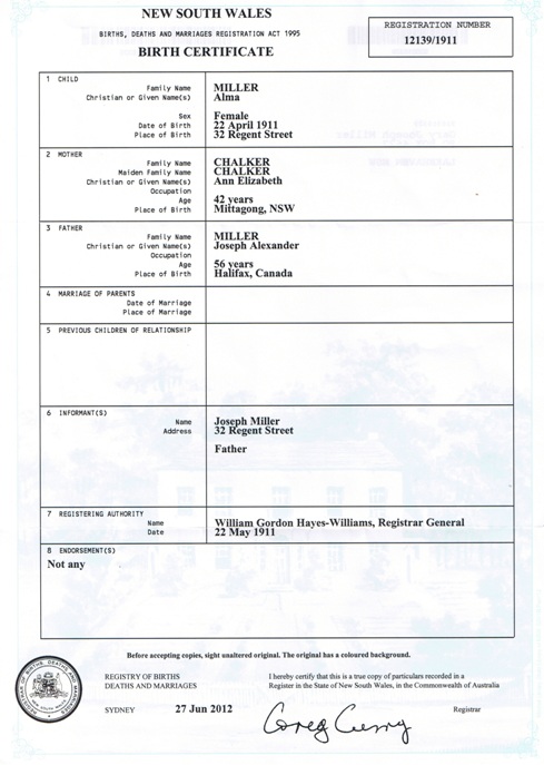 Alma was born on 22 April 1911 at 32 Regent Street, Chippendale.