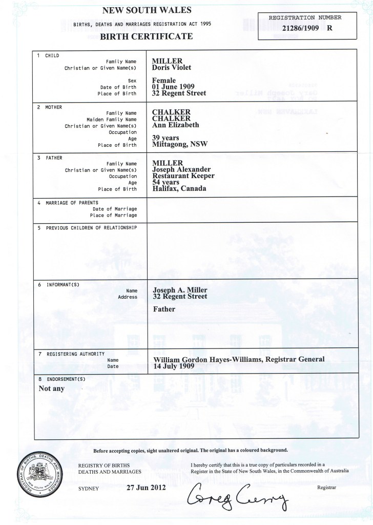 While the house was being rebuilt, the family lived at 374 Pitt Street, where JA advertised Meals for 4d and Weekly Residence from 10/6. Doris’s birth certificate extract lists Ann Elizabeth Chalker, aged 39, as her mother.