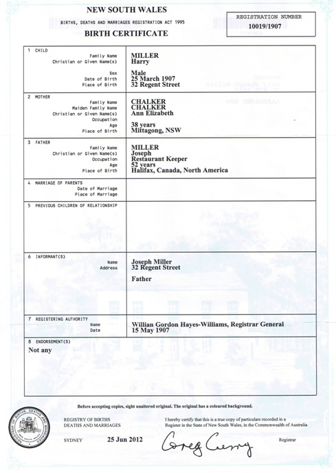 Harry was born on 25 March 1907 at 32 Regent Street, Chippendale.