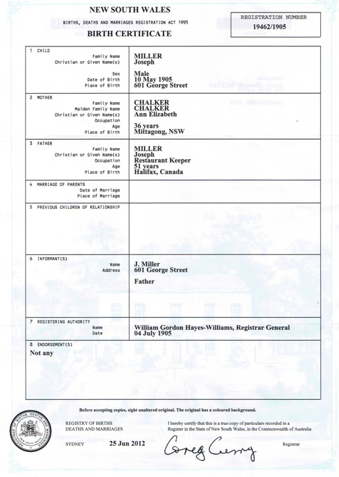 His birth certificate survives only as an extract, which records his mother as Ann Elizabeth Chalker, aged 36, from Mittagong. JA is described as a restaurant keeper from Halifax, Canada. The marriage date is not recorded.