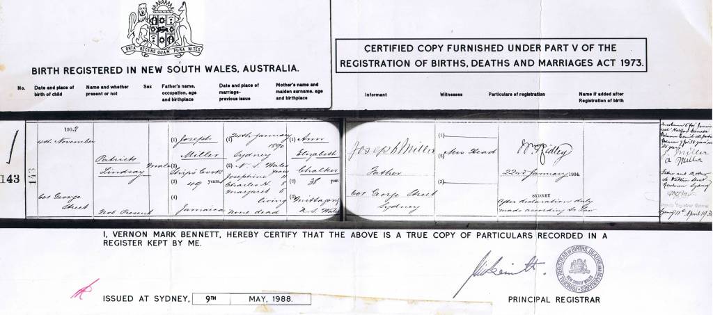 Patrick’s birth certificate lists his mother as Ann Elizabeth Chalker, aged 38, from Mittagong, with a marriage date of 24 January 1890. JA described himself as a ship’s cook, born in Jamaica.