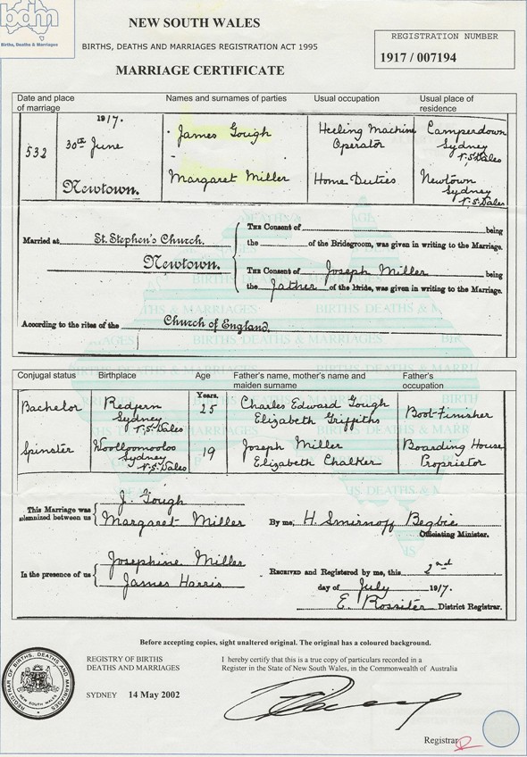 Margaret married James Gough on 30 June 1917 in Newtown, at the age of 19. They had ten children.