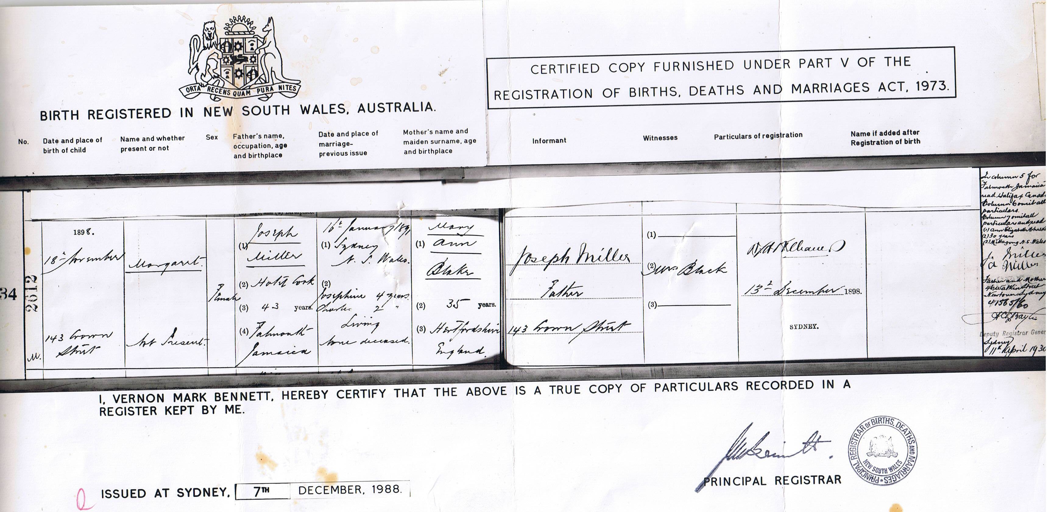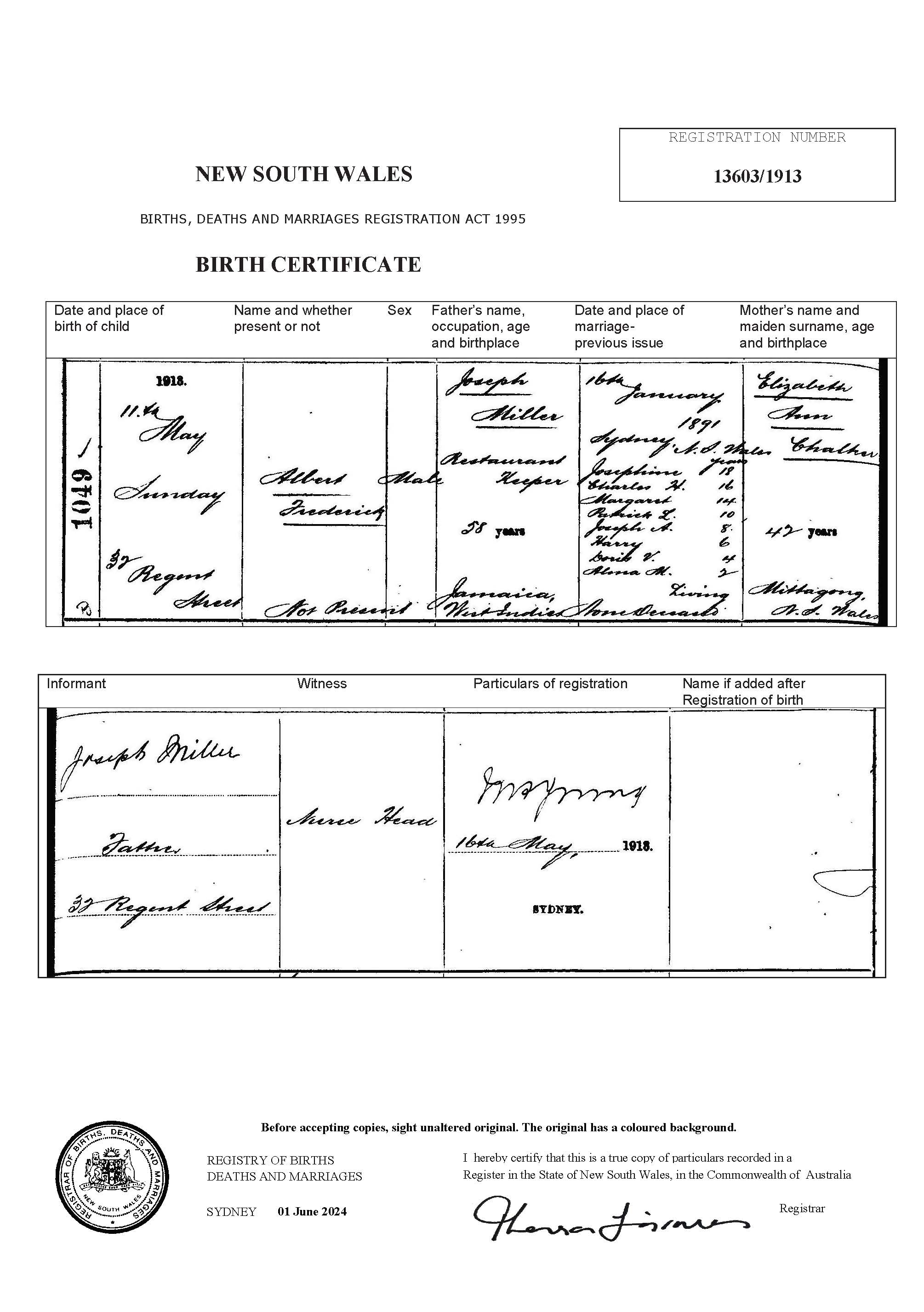 His original birth certificate records Elizabeth Ann Chalker, aged 42, from Mittagong, as his mother, with a marriage date of 16 January 1891 — the same date used on Margaret’s certificate fifteen years earlier. JA described himself as a restaurant keeper, born in Jamaica, West Indies.